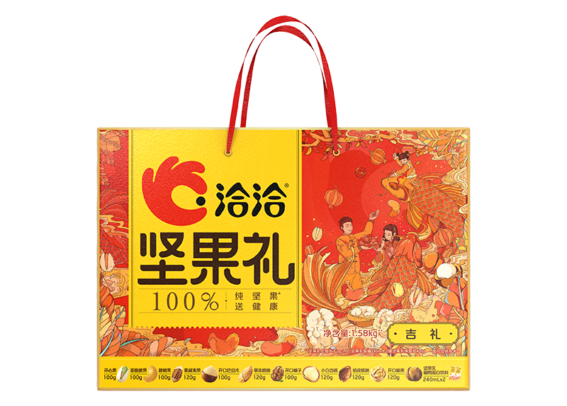 内容物:开心果100g、香脆腰果100g、碧根果100g、夏威夷果120g、开口巴旦木100g、纸皮核桃120g、草本核桃120g、开口榛子100g、小白杏核120g、开口板栗120g、坚果乳植物蛋白饮料240mL*2